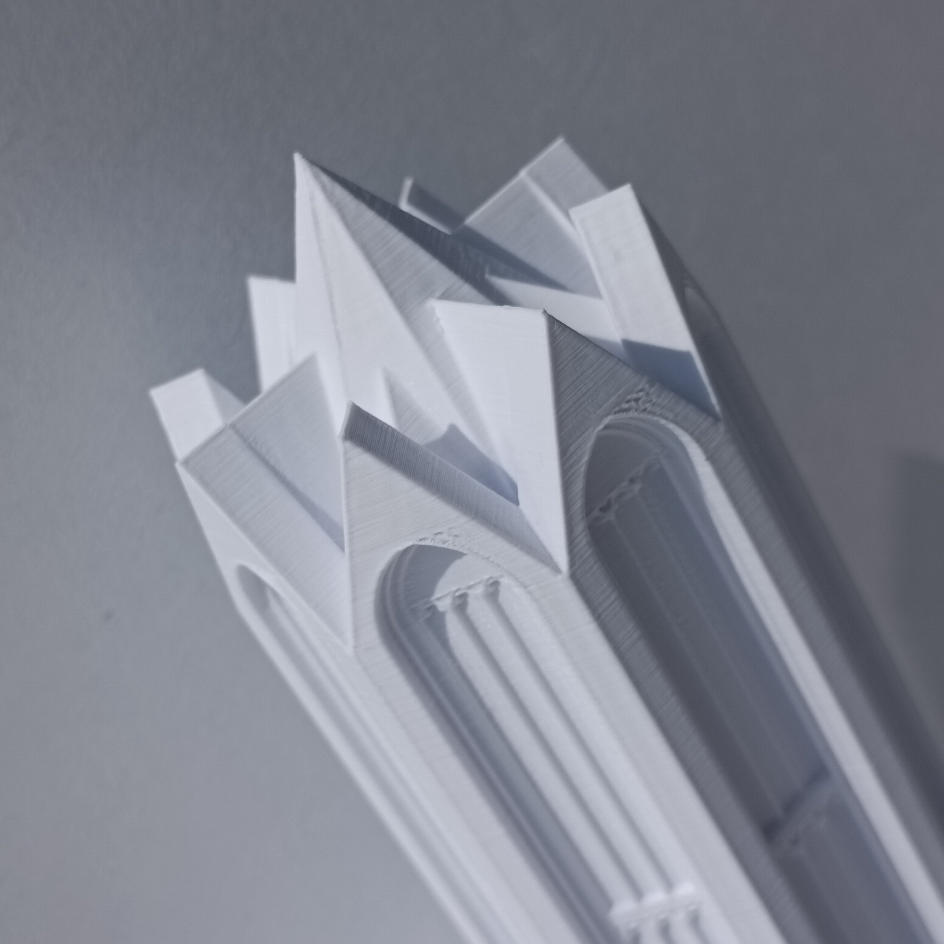 De 3D print is helemaal zoals de real deal. compleet met sleufraampjes bij de wenteltrap. En de oude verbindingrestanten met de Domkerk.